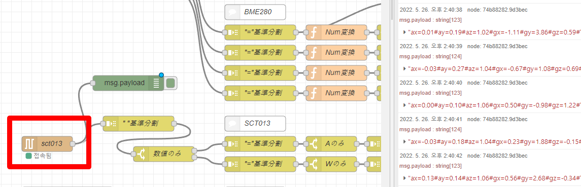 노드레드를 확인해 보니 전류센서로 고정했던 usb포트에서 가속도 값이 갱신되고 있었다.