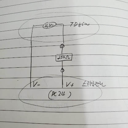 (전압측정을 위해서 V+쪽에 239.5Ω 저항을 장착. 아래 참고