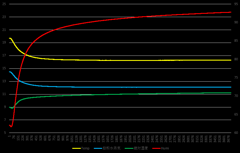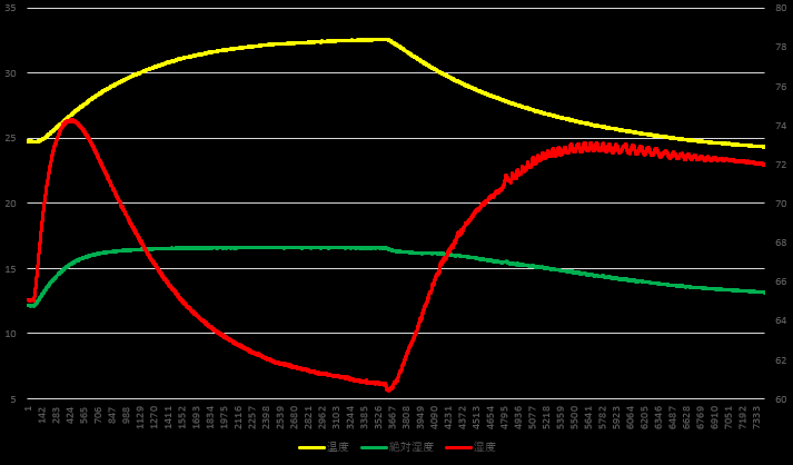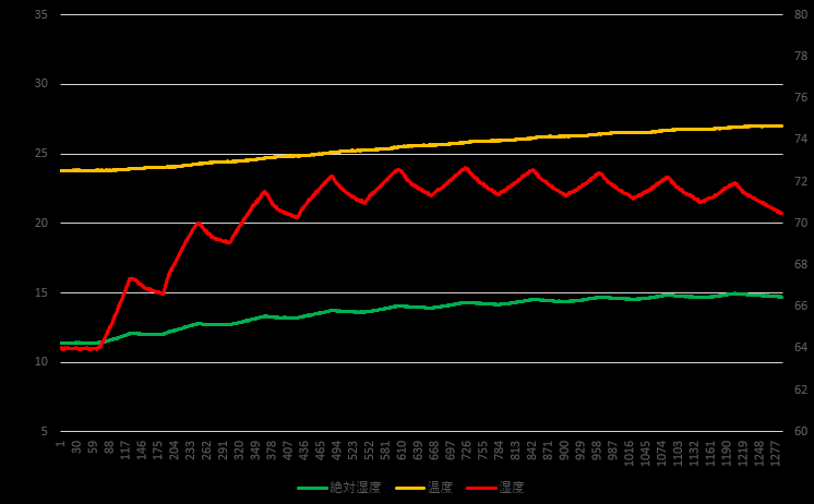 포화 수증 기압과 포화 수증기량에서 용적 절대 습도를 계산하면 그래프에서 초록색 선으로 나타난다. 절대 습도와 온도의 관계만 보면 온도 상승 시 센서가 감지하는 수증기량도 증가하는 것처럼 보인다. 센서가 모터의 상단부에 설치되어 있으므로 온도 변화에 따른 공기 순환에 영향이 있는 걸까 하고 생각하지만, 알 수는 없다.