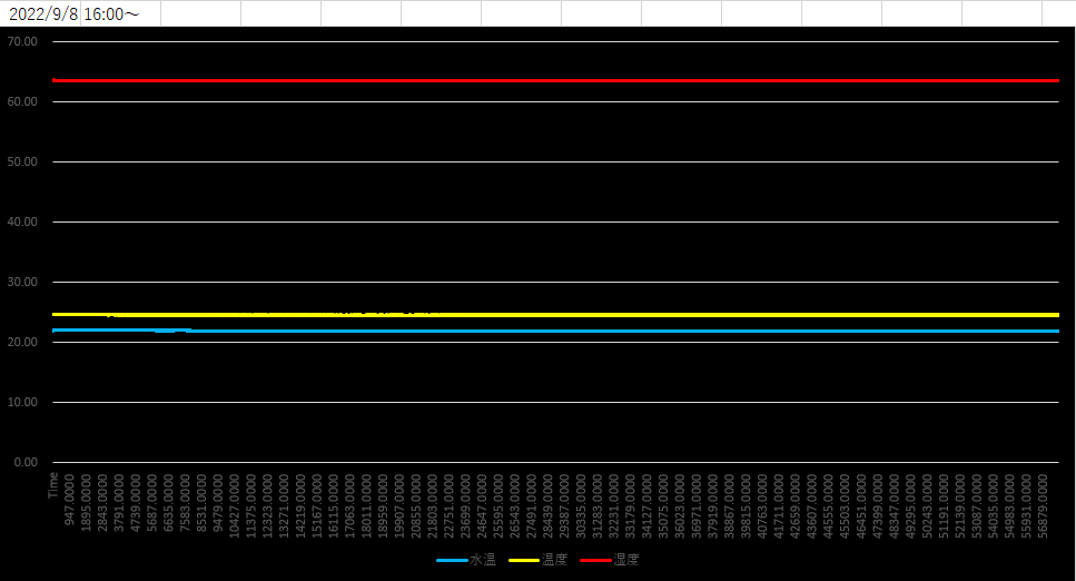초당 1회씩 16시간간 측정한 값의 평균값은 수온 21.93, 펌프 내 공기 온도 24.58, 상대습도 63.55