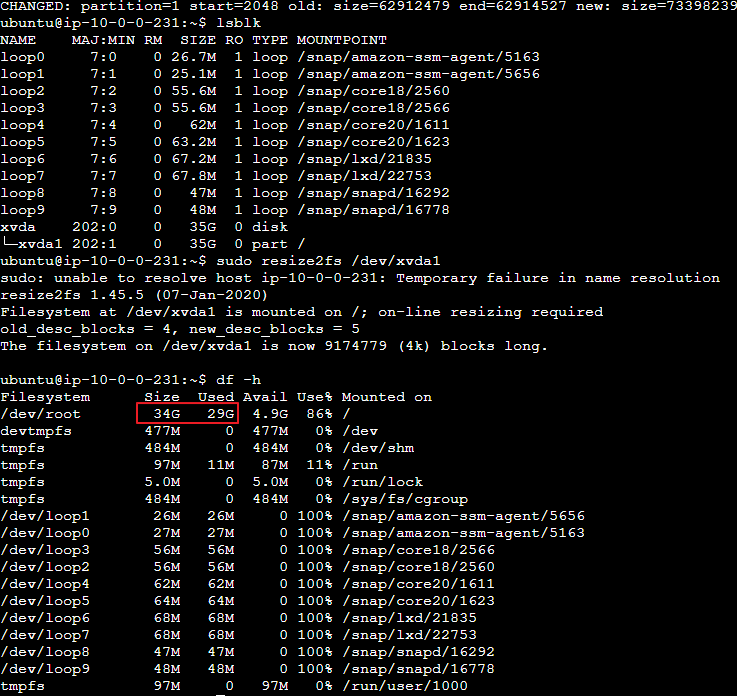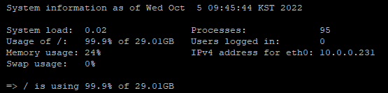 ec2를 접속해서 사용중인 스토리지의 용량을 확인하니 사용량이 99.9%로 더 이상 기록할 수 없는 상태.