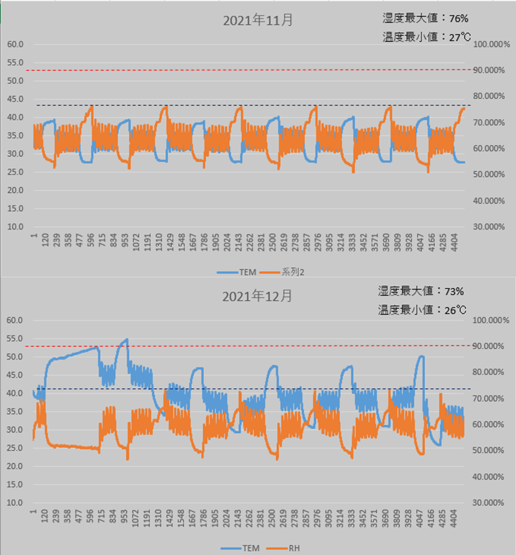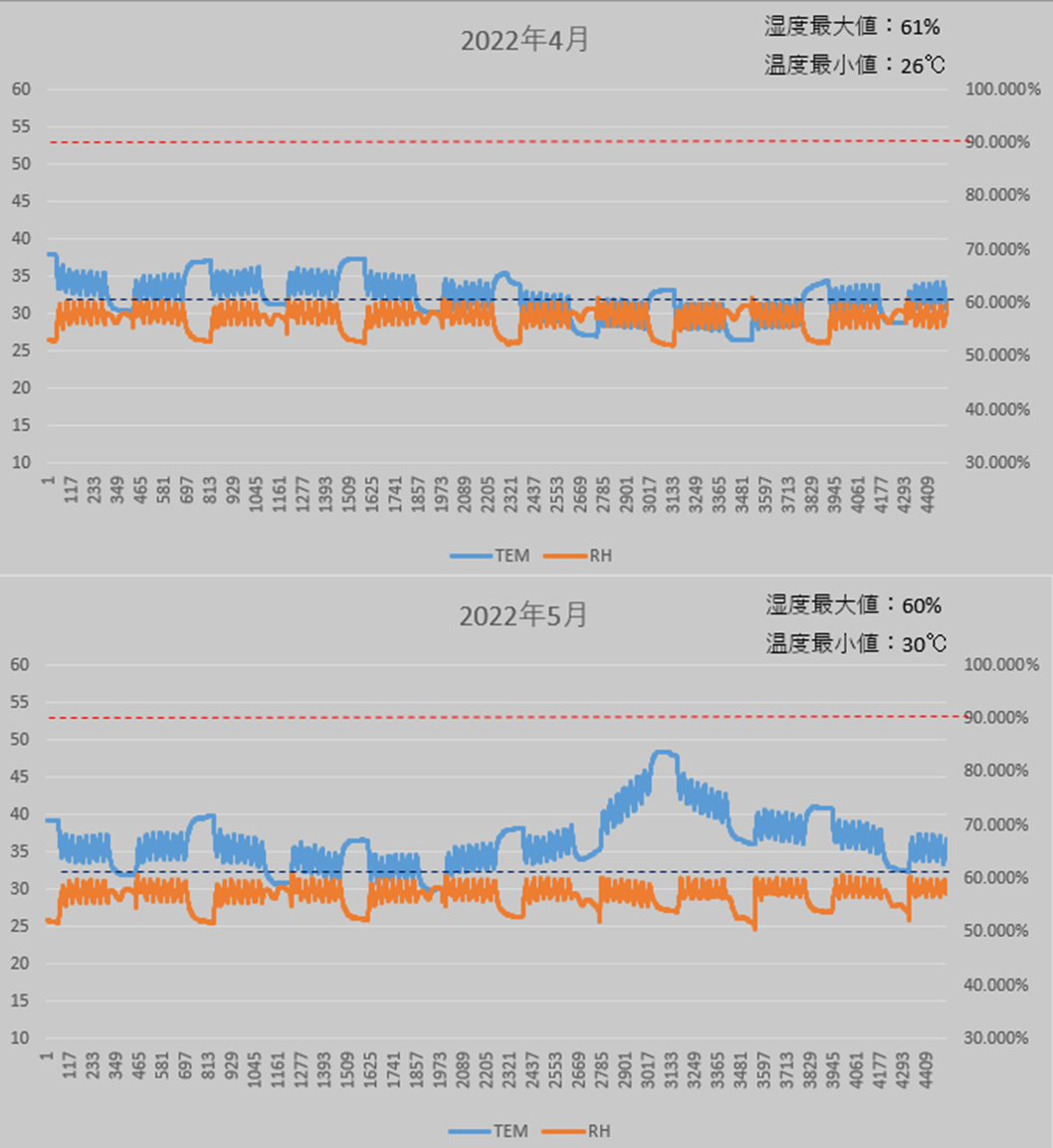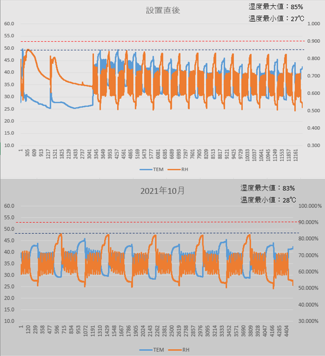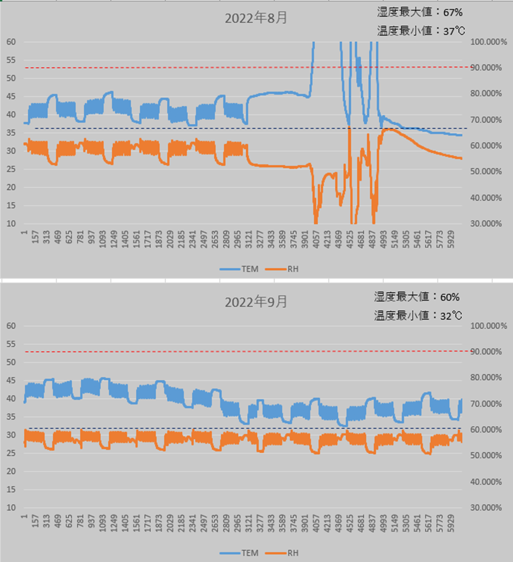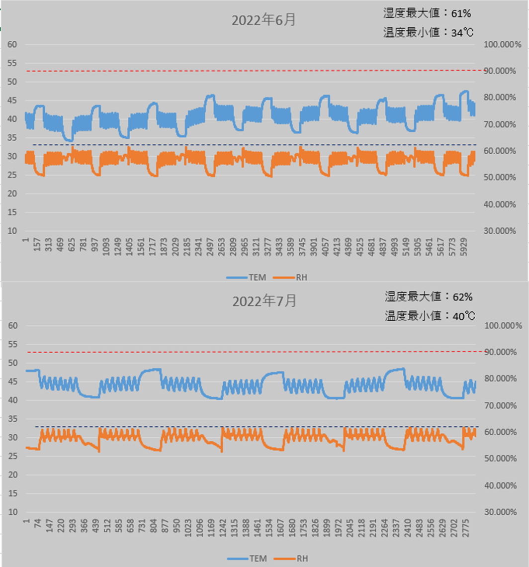 모터의 운전상태에 따라서 내부온도가 변하고, 그에 반비례해서 상대습도도 변하는데