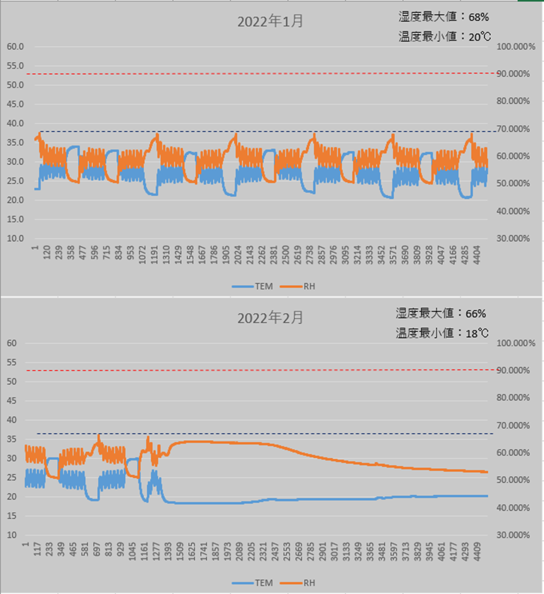 당시에는 별 생각하지 않고 넘어갔는데, 월별로 보니 그 뒤로 변화폭이 점점 줄어들어 지난 올해 4월 시점부터 현재까지 최고 습도 값은 60%를 유지하고 있다.